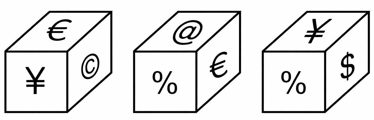 Three different positions of the same dice are shown. Select the symbol that will be on the face opposite to the one having € SSC CHSL 2022-16.03.2023-2