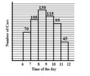 The number of cars passing the road near a colony from 6am to 12 noon has been showing in the following histogram. What is the ratio of the number of cars passed between 6am and 8am to the number of cars passed between 9am and 11am?