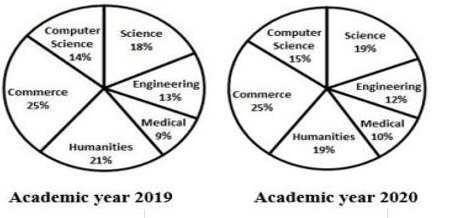 The following pie-charts show the number of students studying in different departments of an institute during the academic years 2019 and 2020. The total number of students was 2000 and 2400 in academic years 2019 and 2020 respectively.