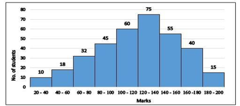 The given histogram represents the marks of students in Mathematics test of a certain class. The total number of students is 350 and the maximum marks of the test are 200.