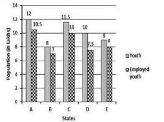 The following bar graph shows the number of youth (in lakhs) and the number of employed youth (in lakhs) in 5 states A, B, C, D and E.