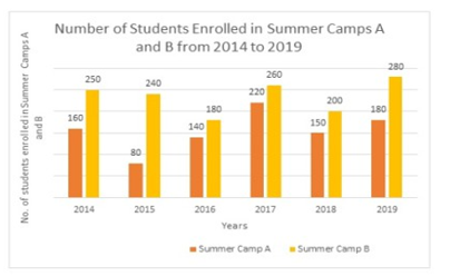 The following bar chart shows the number of students enrolled in two summer camps A and B from 2014 to 2019.