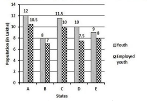 The following bar graph shows the number of youth (in lakhs) and the number of employed youth (in lakhs) in five states A, B, C, D and E.