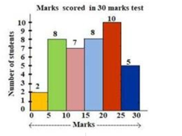 The following histogram shows the marks scored by 40 students in a test of 30 marks. A student has to score a minimum of 10 marks to pass the test. How many students have passed the test and obtained less than 50% of marks?