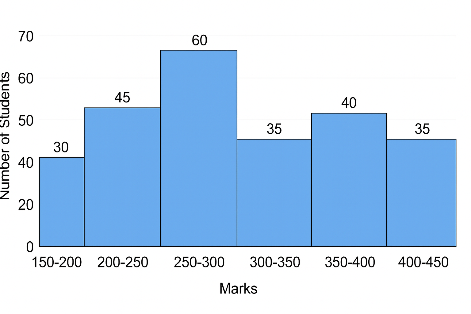 Study the given histogram that shows the marks obtained by students in an examination and answer the question that follows.