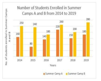 The following bar chart shows the number of students enrolled in two Summer Camps A and B from 2014 to 2019.