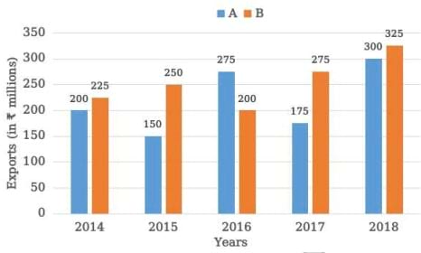 The given graph shows the exports of cars of type A and B (in Rs.millions) from 2014 to 2018. Study the graph and answer the question that follows.
