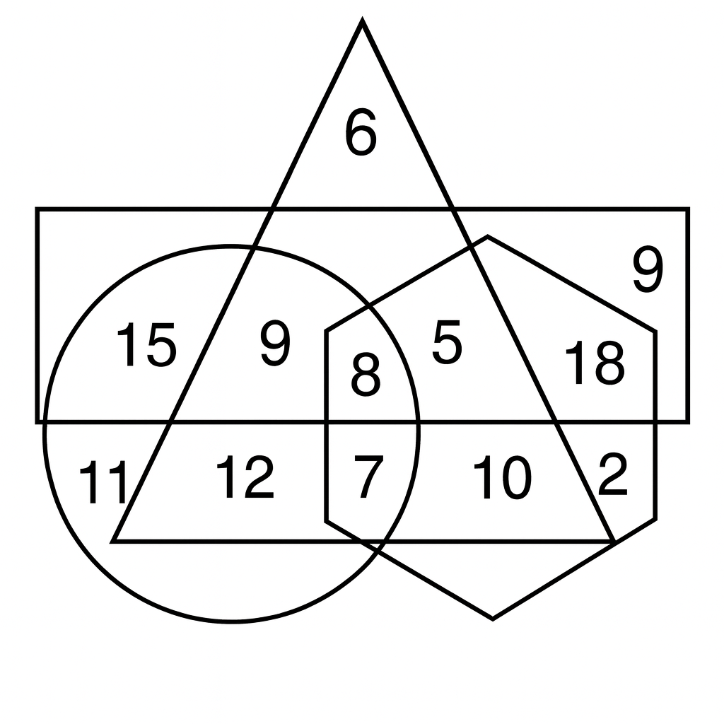 In the following Venn diagram, the hexagon stands for 'captains' , the triangle stands for 'girls', the recatngle stands for 'toppers', and the circle stands for 'social activists'. The given numbers represent the number of persons in that particular category.