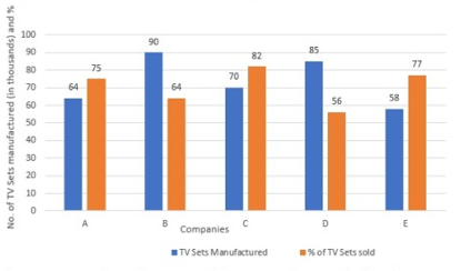The given bar chart represents the number of TV sets manufactured (in 1000s) and the respective % of those TV sets sold by 5 different companies A,B,C,D,E in 2015.