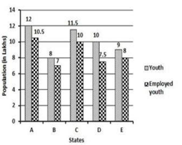 The following bar graph shows the total number of youth (in lakhs) and the number of employed youth (in lakhs) in states A, B, C, D and E. How many youth (in lakhs) are unemployed in states B and D taken together?