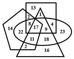 In the following Venn diagram, the oval stands for ‘chartered accountants’, the pentagon stands for ‘males’, the triangle stands for ‘full-time employees’, and the square stands for ‘tax-payers’. The given numbers represent the number of persons in that particular category.
