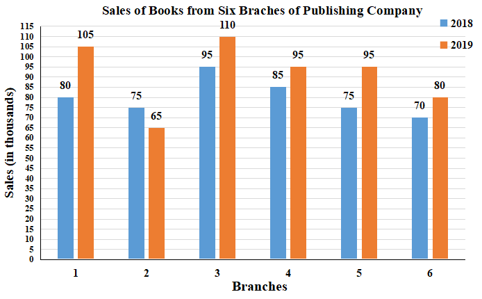 The following bar graph shows the sales of books (in thousands) from six branches of a publishing company during two consecutive years 2018 and 2019.