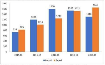 The import and export of a country (in lakhs rupees) during a certain period of time is given in the following bar graph.