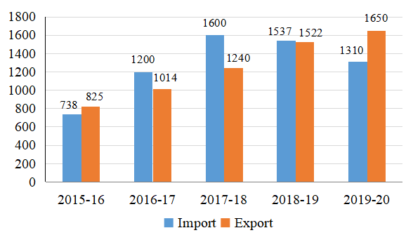 The import and export of a country ( in lakhs rupees) during a certain period of time is given in the following bar graph.