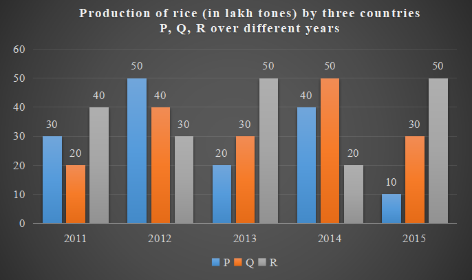 The given bar graph shows the data of the production of rice (in lakh tons) by 3 different countries P,Q and R over the years mentioned. Study the graph and answer the question.