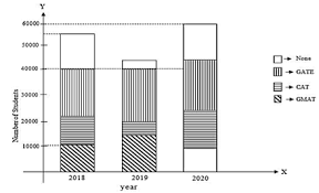 The graph represents number of students who qualified in GATE, GMAT and CAT exams and those who qualified in none of these. (given that there are no students who passed two or more exams) The percentage of students who qualified in at least one of the three exams in 2018 was: