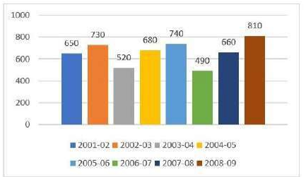The graph shows the profit ( in lakhs) made by a company from 2001-2002 to 2008-2009.