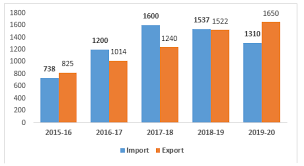 The import and export of a country ( in lakhs) during a certain period of time is given in the following bar graph. Read the graph and answer the questions carefully.