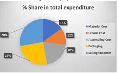 The following figure shows the different expenses that are incurred in manufacturing toys. If the total expenditure is 23,00,000, then how much expenditure was incurred on Material Cost and Selling Expenses (in %)?