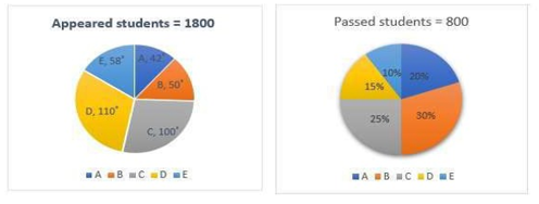 The following pue chart shows the data of the number of appeared and passed students of class 12 in sections A,B,C,D,E