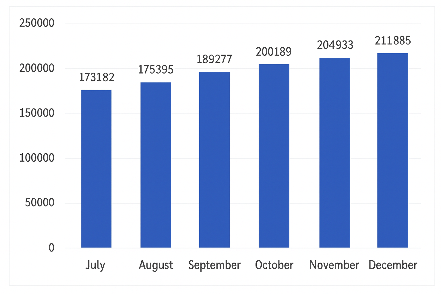 The following bar graph shows the circulation growth of a magazine ABC from July 2022 to December 2022.