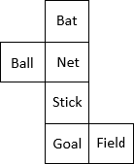 A cube is constructed by folding the given sheet along the lines shown. In the cube so formed, what would be the word on the opposite side of ‘Ball’?