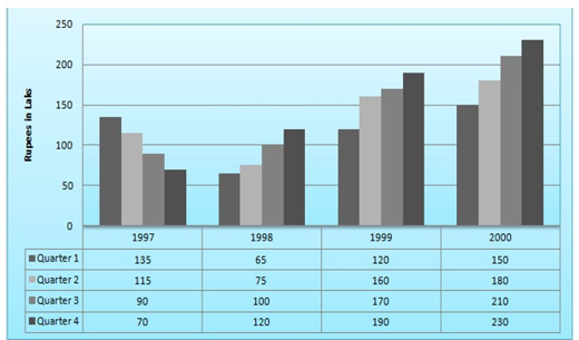 Following bar graph shows the quarterly profit (in lakhs) of a departmental store from 1997-2000.