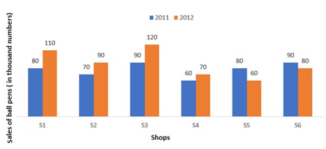 The bar graph shows the sals of ball pens (in thousand numbers) from six shops S1,S2,S3,S4,S5,S6 during 2 consequetive years, 2011 and 2012.