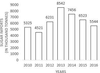 The given bar graph shows sugar imports of a country (in thousand tonnes) over the years. Study the graph and answer the question that follows.