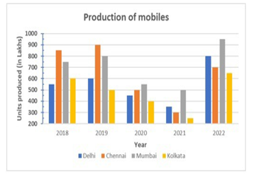 The following figure shows production of mobiles in lakh units of 4 cities in different years. study the figure and answer the question that follows .