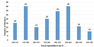 The following histogram represents the distribution of household expenditure (in ₹) of 200 manual workers in a city.