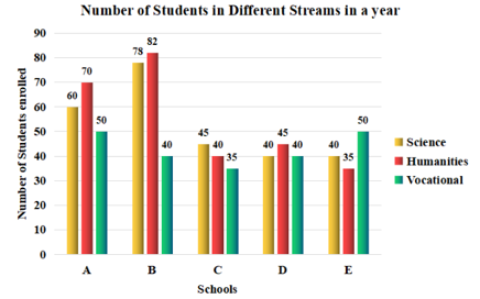 The number of students enrolled in different streams at Senior Secondary level in five schools has been shown in the bar graph. What is the ratio of the number of students enrolled in the vocational stream in schools A, C and E taken together to those enrolled in the humanities stream in the schools B, D and E taken together?