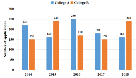 The bar graph represents the total number of applications received for B.Sc. Mathematics by two different colleges A and B in 5 different years.