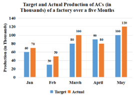 In which month is the actual production of ACs 20% more than its target production?