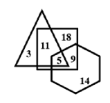 In the Venn diagram given below, if 'Hexagon' represents 'Farmers', 'Triangle' represents 'Villagers' and 'Square' represents 'Beneficiaries', then how many Farmers are there who are Villagers and Beneficiaries also?