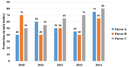 A soft drink company prepares drinks of three different flavors - A, B and C. The production of the three flavors over a period of five years from 2010 to 2014 has been expressed in the given bar graph.