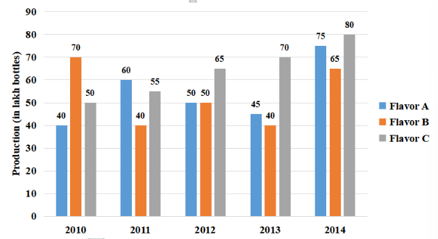 Study the given bar graph and answer the question that follows. A soft drink company prepares drinks of three different flavors A, B and C. The bar graph shows the production of three flavors over a period of five years from 2010 to 2014.