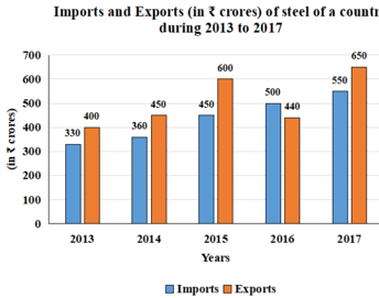Study the bar graph which shows the imports and exports (in ₹) of steel of a country during 2013 to 2017 and answer the question that follows.