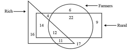 In the given diagram, the circle stands for ‘farmers’, the rectangle stands for ‘rural’, and the triangle stands for ‘rich’. The numbers given in the different segments represent the number of persons of that category.