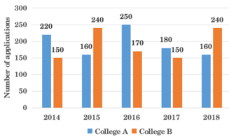 The bar graph represents the total number of applications received for B.Sc. Mathematics by two different colleges A and B in 5 different years.
