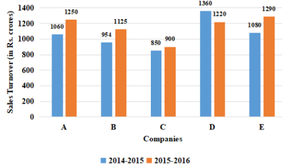 The given bar graph represents the Sales Turnover (in ₹ crore) of five automobile companies A, B. C, D and E during 2014-2015 and 2015-2016. The X-axis represents the Companies, and the Y-axis shows the Sales Turnover (in ₹ crore).