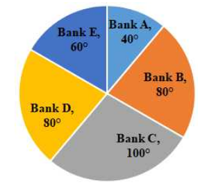 The given pie chart shows the distribution of money spent by Aditya through credit cards of different banks A, B, C, D and E. The total money spent by him through credit cards in a year is ₹3,60,000.