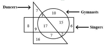 In the given diagram, the shapes indicate the categories of persons. The numbers given in the different segments represent the number of persons in that category. How many dancers are either gymnasts or singers but NOT both?