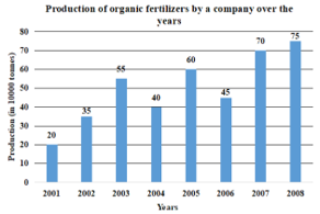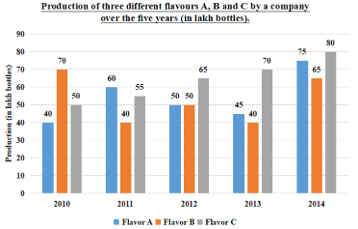 A soft drink company prepares drinks of three different flavours A, B and C. The bar graph shows the production of three flavours over a period of five years from 2010 to 2014.