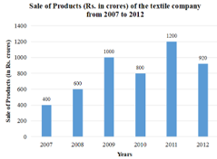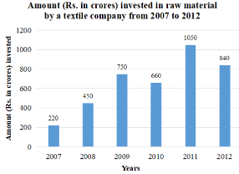 The bar graphs represent the amountinvested in raw materials (in ₹ crore) and the sale of the products, by a textile company in the years 2007— 2012. The X-axis represents the years. The Y-axis represents the amount invested in raw materials (in ₹ crore) in figure 1 and sale of products in figure 2, respectively.