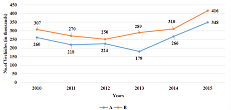 The line graph represents the number of vehicles (in thousands) manufactured by two automobile companies A and B over the years from 2010 to 2015. The X-axis represents the years and the Y-axis represents number of vehicles in thousands.