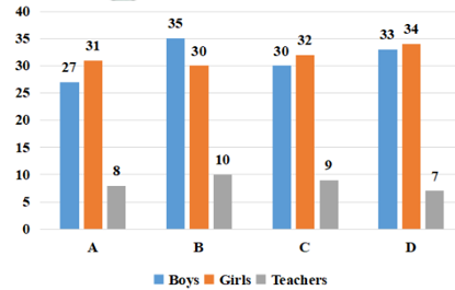 The given bar-graph shows the number of boys and girls in classes A, B, C and D in a school, and the number of teachers allotted to each class.
