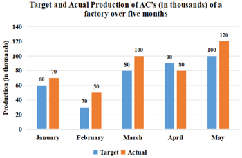 Study the given graph which shows the target and actual production of ACs (in thousands) of a factory over five months and answer the question that follows.