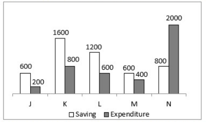 The bar graph given below shows the saving and expenditure of 5 companies J, K, L, M and N.