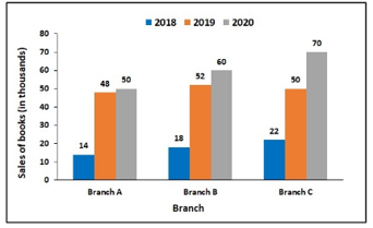 The following bar graph shows the sales of books (in thousands) from 3 branches of a company in three consequtive years 2018, 2019 and 2020.